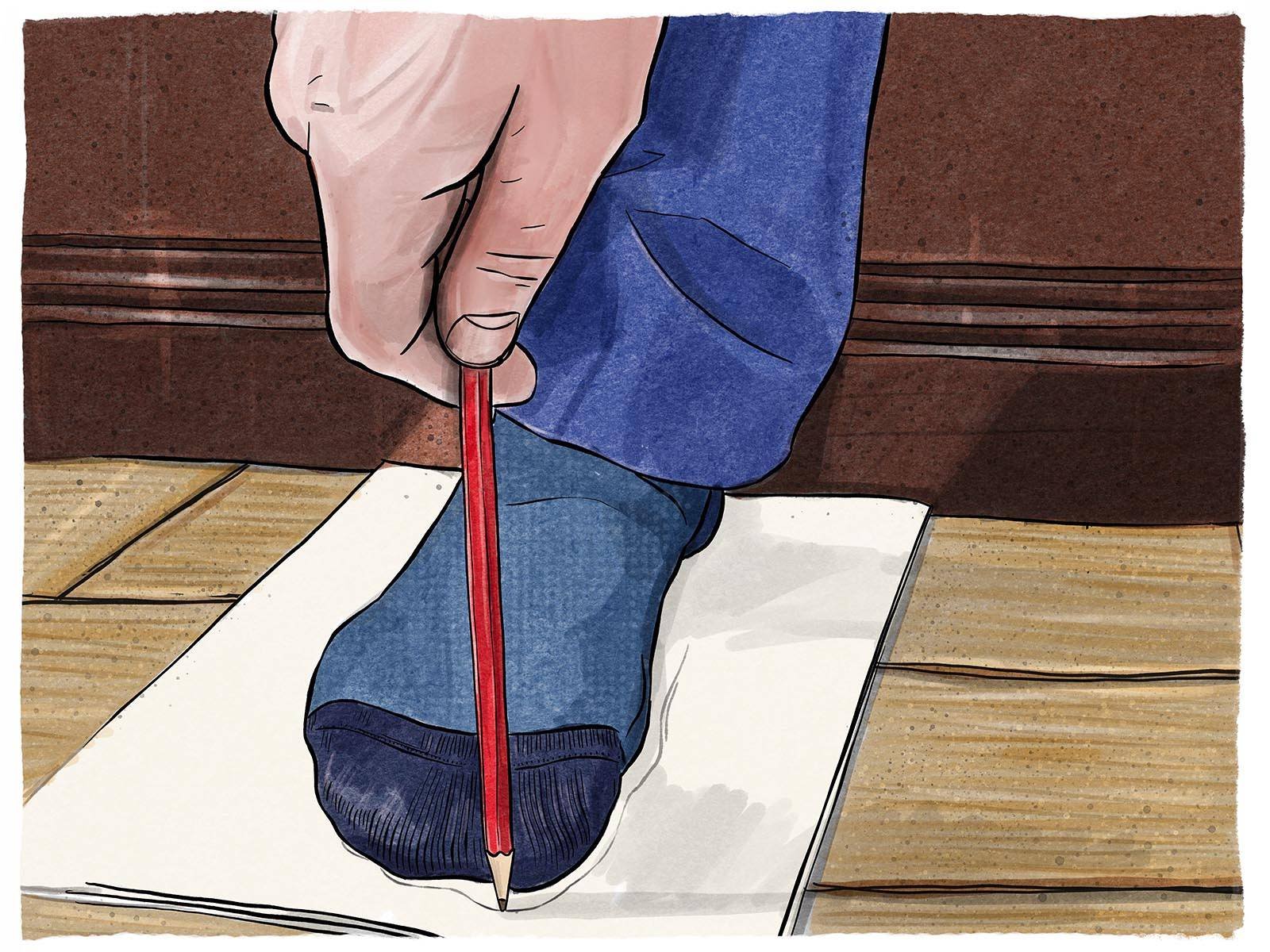 Stand with your heel gently touching the wall and place your foot firmly on the paper. Carefully trace the outline of your foot.